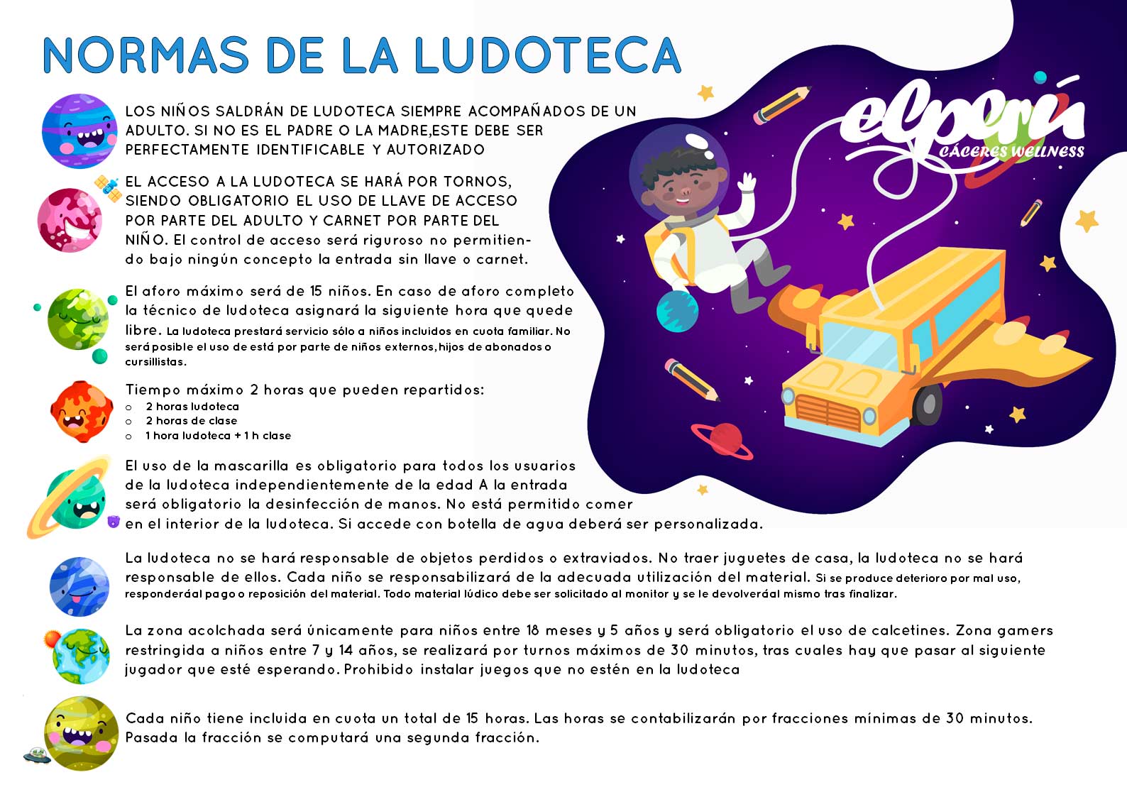 La zona acolchada será únicamente para niños entre 18 meses y 5 años y será obligatorio el uso de calcetines. Zona gamers restringida a niños entre 7 y 14 años, se realizará por turnos máximos de 30 minutos, tras cuales hay que pasar al siguiente jugador que esté esperando. Prohibido instalar juegos que no estén en la ludoteca.