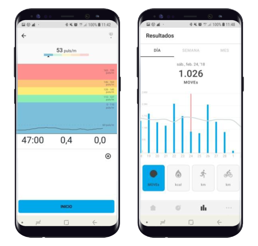 BOTÓN RESULTADOS: En el tercer botón puedes ver gráficas arrastrando abajo la página. La línea roja indica el día de hoy y se mueve arrastrando el gráfico. La distancia tiene dos bloques: andando y corriendo y otro para todo lo demás (como natación y bici). También aparecen datos biométricos como tu porcentaje de grasa, así como otros índices de salud. También introduce aquí tu umbral de potencia para trabajar en las bicis de ciclo.