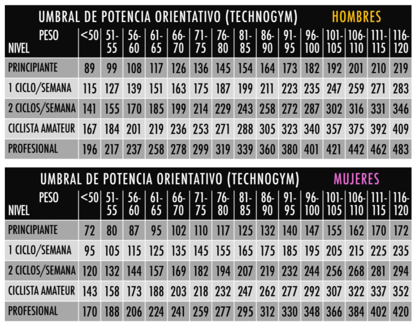 El umbral de potencia indica nuestro nivel de entrenamiento con una estimación de cuántos vatios podemos desarrollar de forma continua en una hora. Con ello estimamos zonas de trabajo según objetivos, desde un 75% del umbral donde quemamos grasa, 100% donde mejoramos nuestra resistencia o 120-150% donde entrenamos intervalos cortos de alta intensidad. Calcula tu umbral con esta tabla: